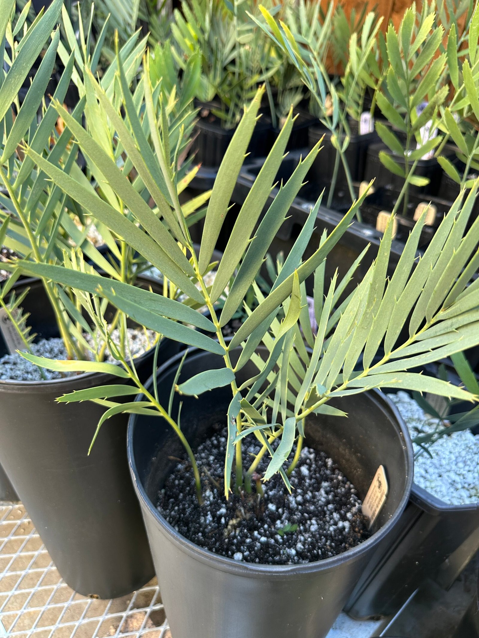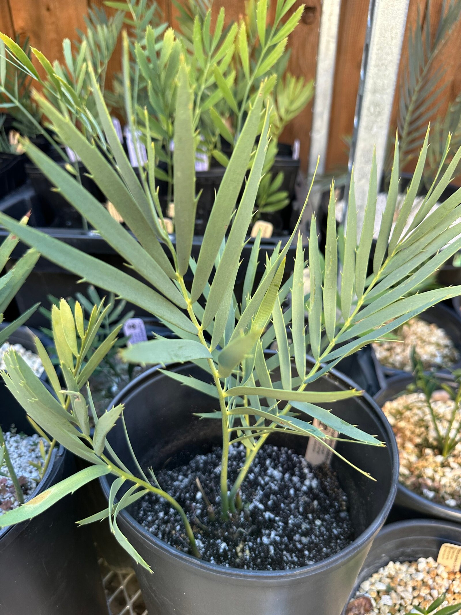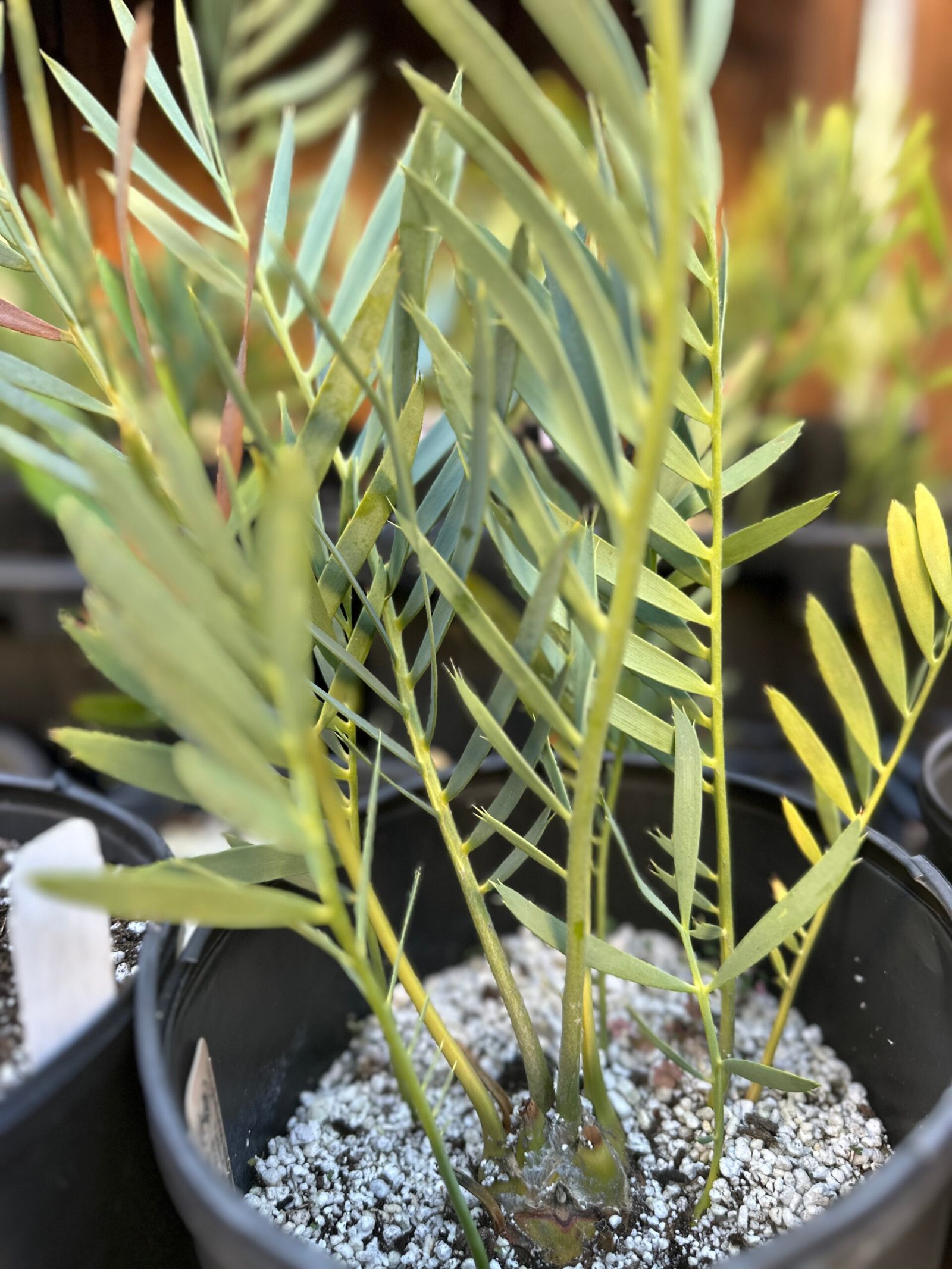 Encephalartos middelbergensis X dyerianus – Transvaal Hybrid Cycad – shown in 5 gallon pots with 1-2″ caudex. If you are looking for color this is one of the bluest Transvaal crosses Ive seen. Parent plants are extremely blue and the hybrid plants produced seem to turn out more blue than both parents.